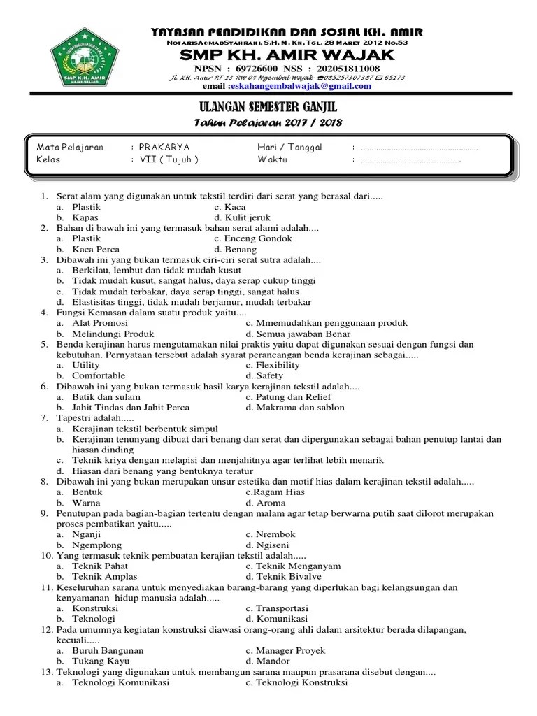 Inflasi juga boleh merujuk kepada peningkatan harga untuk barangan . Latihan soal prakarya kelas 7 smp/ mts semester 1 bab 2, kerajinan tekstil. Kumpulan soal akm asesmen kompentensi minimum didno76 com bab 1, kerajinan serat dan tekstil. Contoh soal prakarya kelas 7 sub materi pokok pembelajaran kerajinan dari bahan serat alam dilengkapi dengan kunci jawaban. Hal yang dibahas pada bab ini adalah sebagai berikut,.